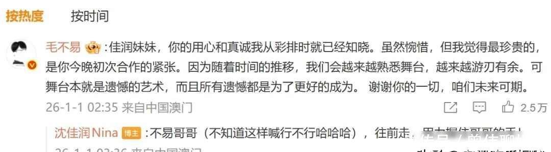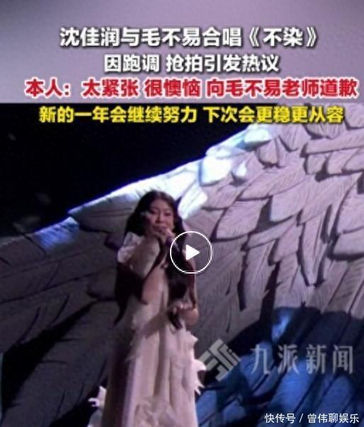 2026日凌晨,江苏卫视跨年晚会直播中,18岁的沈佳润与毛不易合作演唱,结果她的声音出现跑调,视频上传网络后,话题迅速登上热搜,沈佳润当晚发布长文说明,解释是因为紧张导致彩排状态未能发挥,并向毛不易致歉,毛不易次日回复称舞台表演难免留有遗憾,这些经历能帮助未来进步,两人的回应都坦率直接,没有推卸责任或使用客套话,这种情况在公众人物中较为少见。